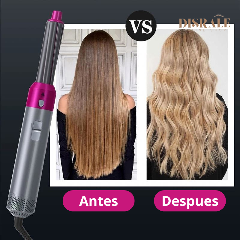 ✨ 5 funciones en 1: Secador, cepillo alisador, peine caliente y dos rizadores para distintos estilos.