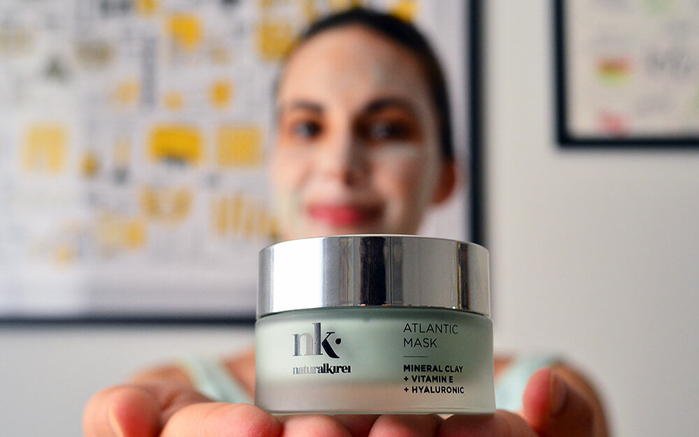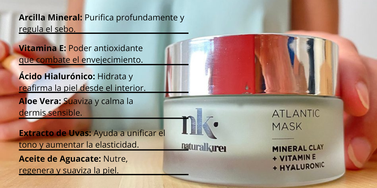 NK Atlantic Mask contiene Arcilla Mineral, Vitamina E, Ácido Hialurónico, Aloe Vera, Extracto de Uvas y Aceite de Aguacate.